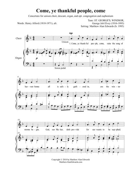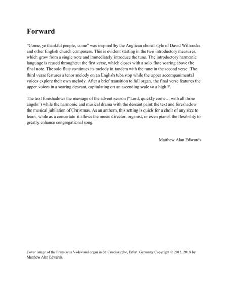 “Come, ye thankful people, come” was inspired by the Anglican choral style of David Willcocks and other English church composers. This is evident starting in the two introductory measures, which grow from a single note and immediately introduce the tune. The introductory harmonic language is reused throughout the first verse, which closes with a solo flute soaring above the final note. The solo flute continues its melody in tandem with the tune in the second verse. The third verse features a tenor melody on an English tuba stop while the upper accompanimental voices explore their own melody. After a brief transition to full organ, the final verse features the upper voices in a soaring descant, capitulating on an ascending scale to a high F. The text foreshadows the message of the advent season (“Lord, quickly come… with all thine angels”) while the harmonic and musical drama with the descant paint the text and foreshadow the musical jubilation of Christmas. As an anthem, this setting is quick for a choir of any size to learn, while as a concertato it allows the music director, organist, or even pianist the flexibility to greatly enhance congregational song.